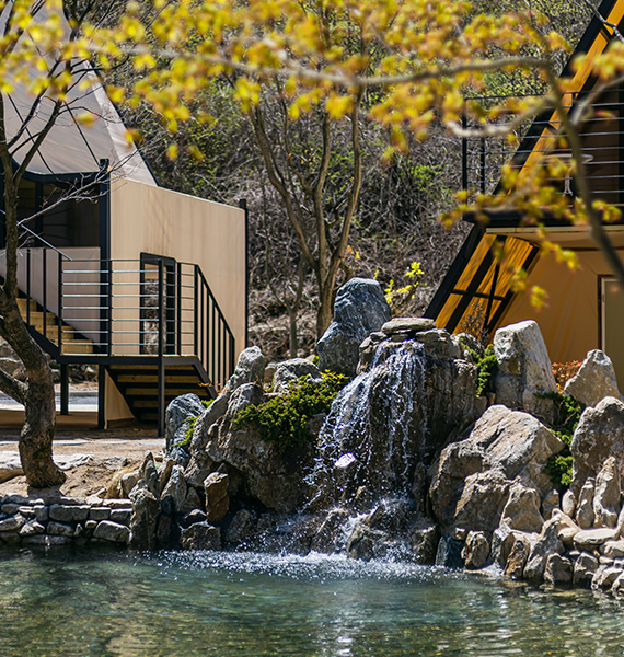 클라우드 글램핑 주변은 숲속과 함께하는 4시간짜리 트레킹 코스와 시원한 계곡이 있습니다. 싱그러운 자연에 둘러싸여 여유로운 힐링을 즐겨보세요.